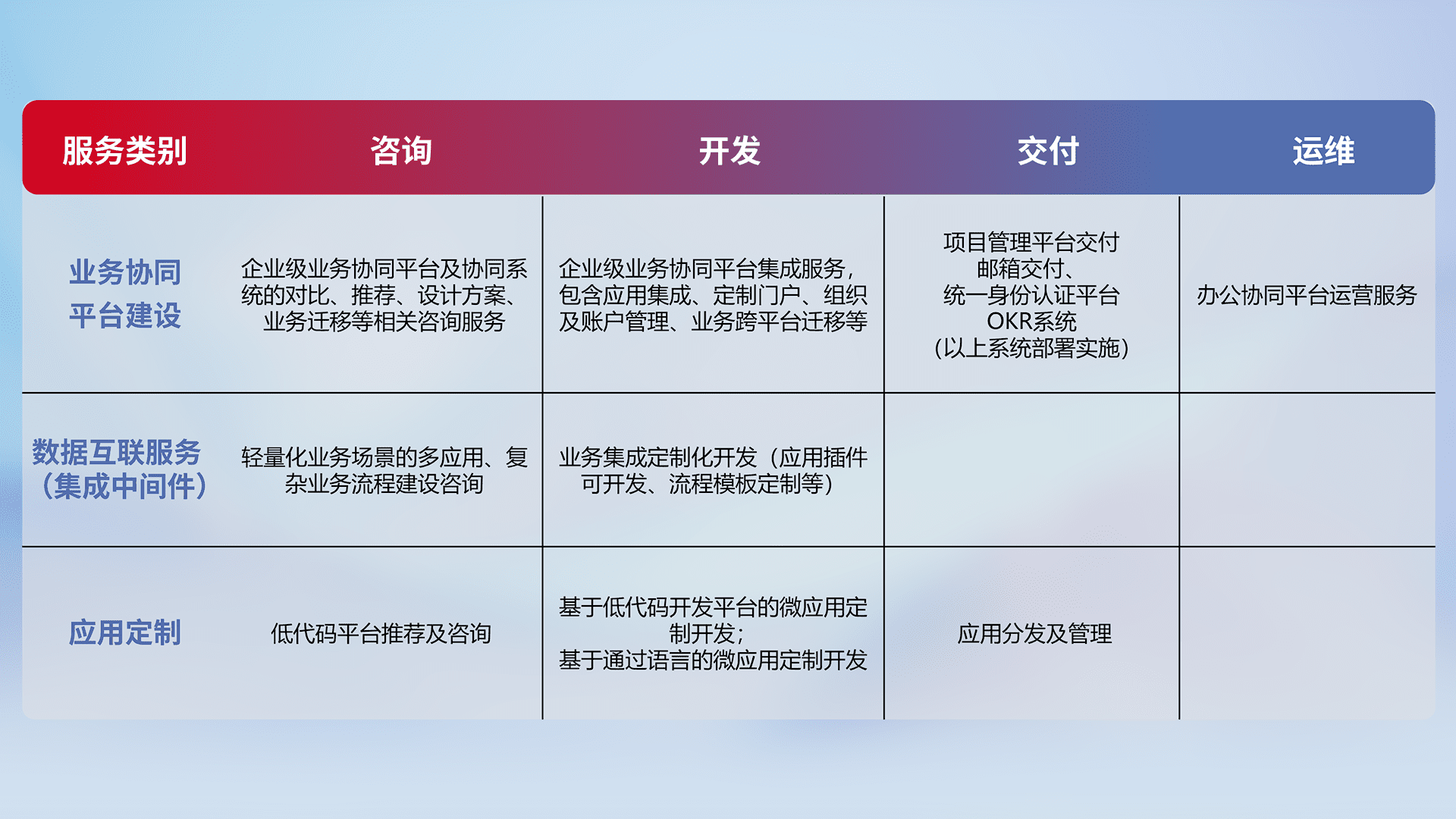 针对钉钉、、企微、、、IDaas等平台级产品提供产品的规划、、方案、、、、交付、、定制化开发等服务,,,实现如统一协同办公、、、、智能客户服务、、混合会议管理、、、、智能数据查询、、、、等业务场景,,,,实现数字化转型。。。